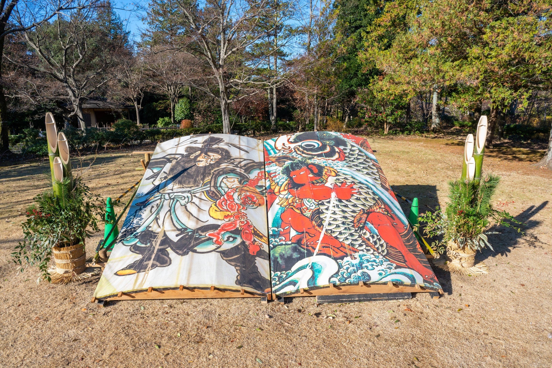 今年は鍾馗(しょうき)様や金太郎などが描かれた凧4枚を、日本庭園内の芝生広場と東門の2箇所に展示しました。これらの凧の絵柄は縁起物として昔から親しまれてきたもので、日本庭園の雰囲気にぴったりです。見て楽しんでいただけるほかに、写真スポットとしてもご利用いただけます。縁起物の凧の前で、大切な方とお写真を撮られてみてはいかかでしょうか?