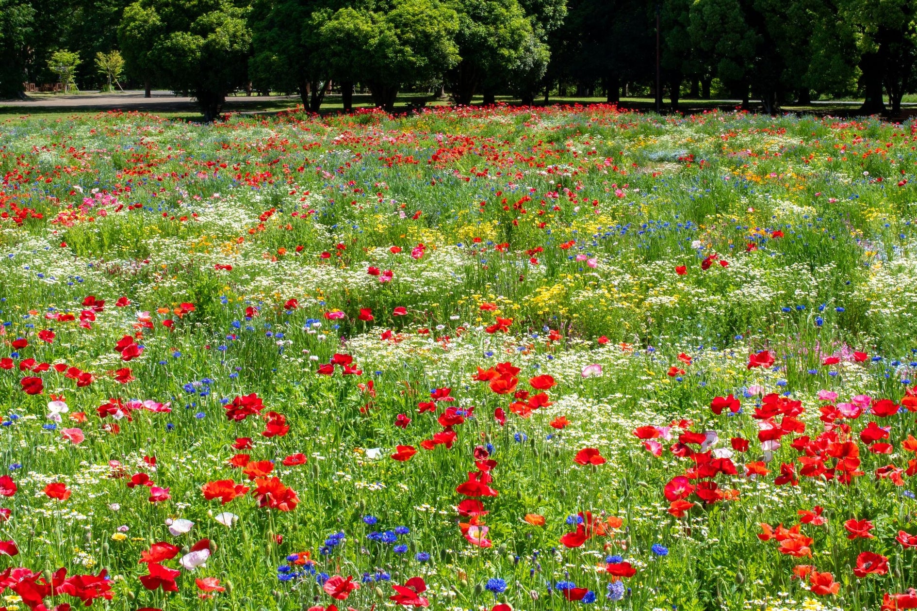 この花畑にはシャーレーポピーやカスミソウ、ジャーマンカモミールなど、18品種20万本の花たちが咲いており、同一品種の大規模花畑とは違ったその華やかさは当公園の魅力の一つです。