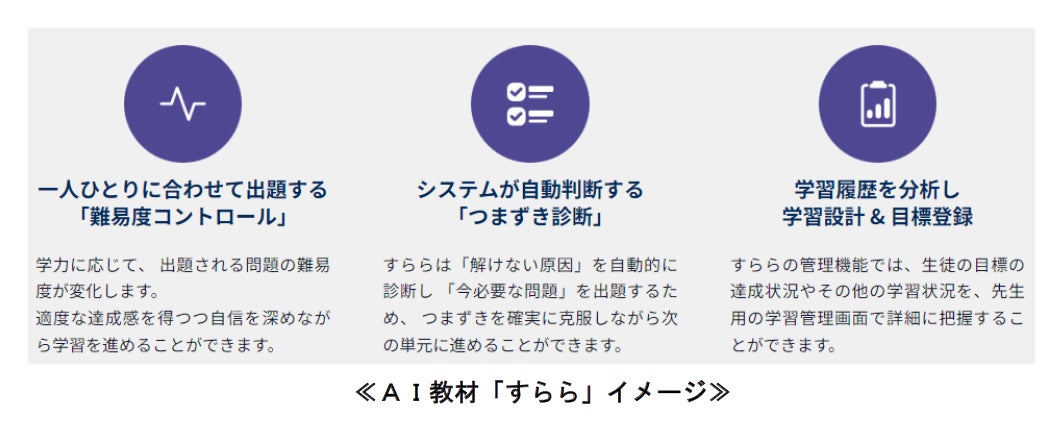 一人ひとりの理解度に合わせて国・数・理・社・英の5教科を学習できるアダプティブなICT教材です。レクチャー機能、ドリル機能、テスト機能により、一人ひとりの習熟度に応じて理解定着→活用のサイクルを繰り返し、学習内容の定着をワンストップで実現できます。