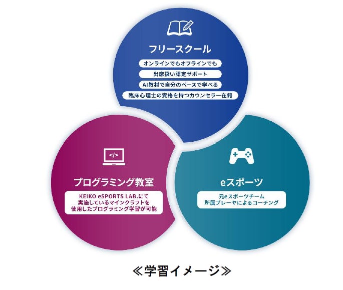 オフライン・オンラインいずれでも出席でき、eスポーツチームコーチによる指導が受けられるほか、AI教材による一人ひとりの理解度に合わせた主要科目(国・数・英・社・理)の学習やカウンセラーによるカウンセリング・個別面談を行うなど専門のスタッフによるサポートを提供します。