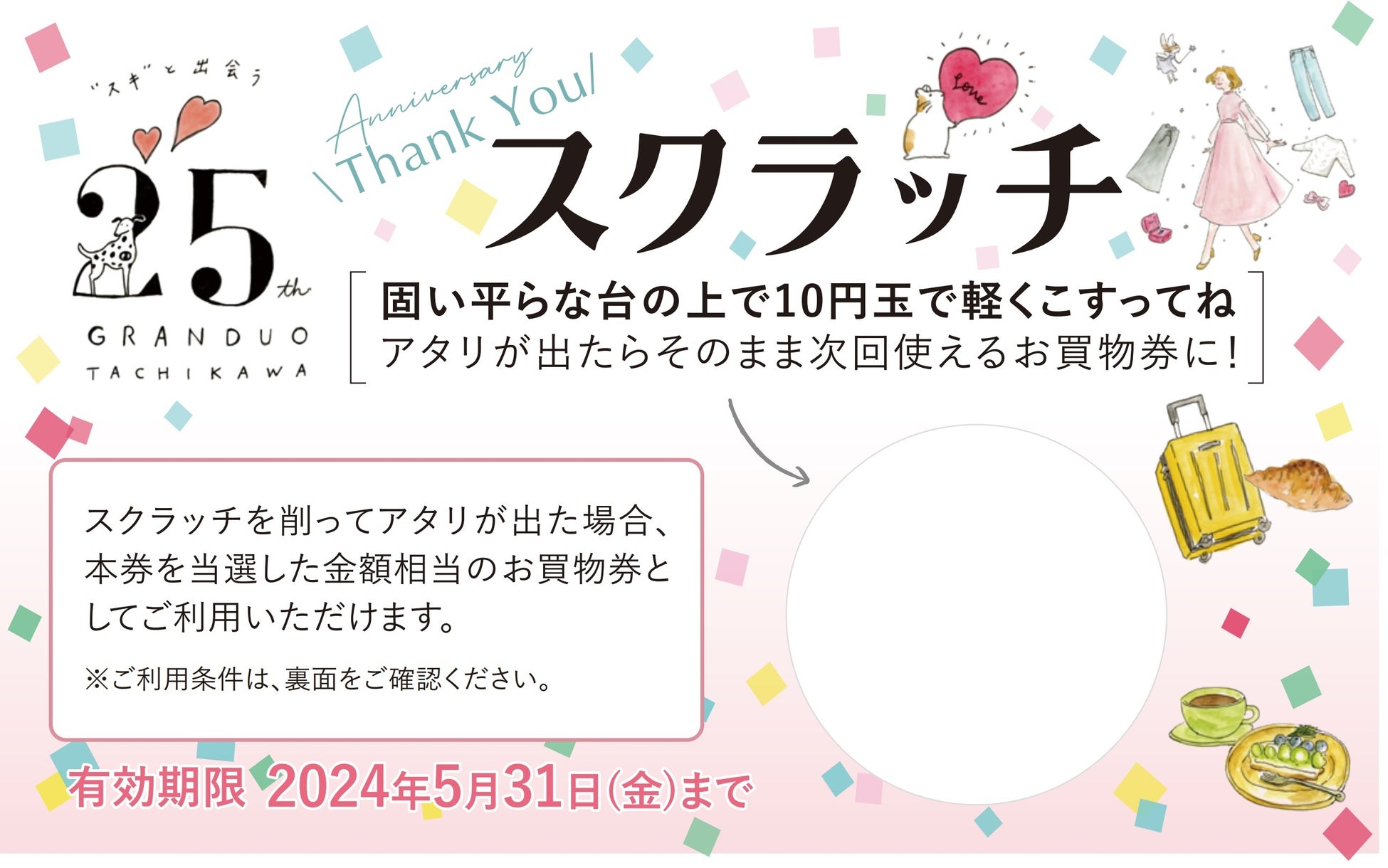 ■開催内容:期間中、1会計2,000円(税込)以上のご利用で、1枚スクラッチカードをプレゼント!削って「アタリ」が出たら、そのまま次回使えるクーポン券に!