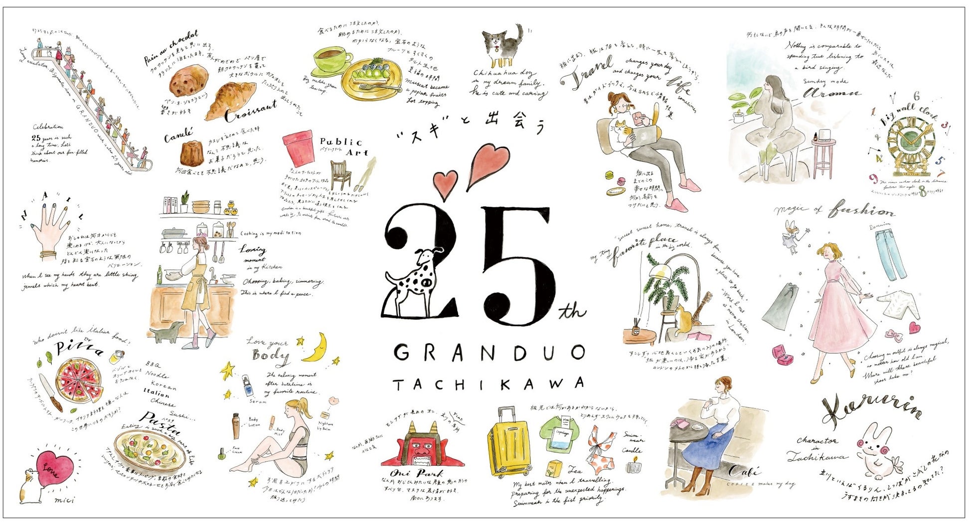 ジェイアール東日本商業開発株式会社(本社:東京都立川市、代表取締役社長:石黒陽一)が運営する商業施設グランデュオ立川では、2024年4月18日(木)に開業25周年を迎えます。これまで支えてくださったお客様へたくさんの「感謝」をお伝えるために、「”スキ”と出会う」と題し、「グランデュオ立川 25th Anniversary」を4月3日(水)から9月30日(月)の期間で開催。お客様ひとり1人の「“スキ”」に出会うことが出来る場所でありたい。これからもそんな場所にしていきたいという思いから、イベントやキャンペーン、各ショップによる素敵な商品・サービスなどお届けします。また、4月1日(月)には、1Fに「京樽」がNEW OPENいたします。