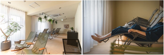 もともと学生さんの憩いの場だった厨房やラウンジを、広々した「ととのいスペース」に。サウナ室や浴室よりも広く取っているため、ゆっくりとお寛ぎいただける空間に仕上げています。