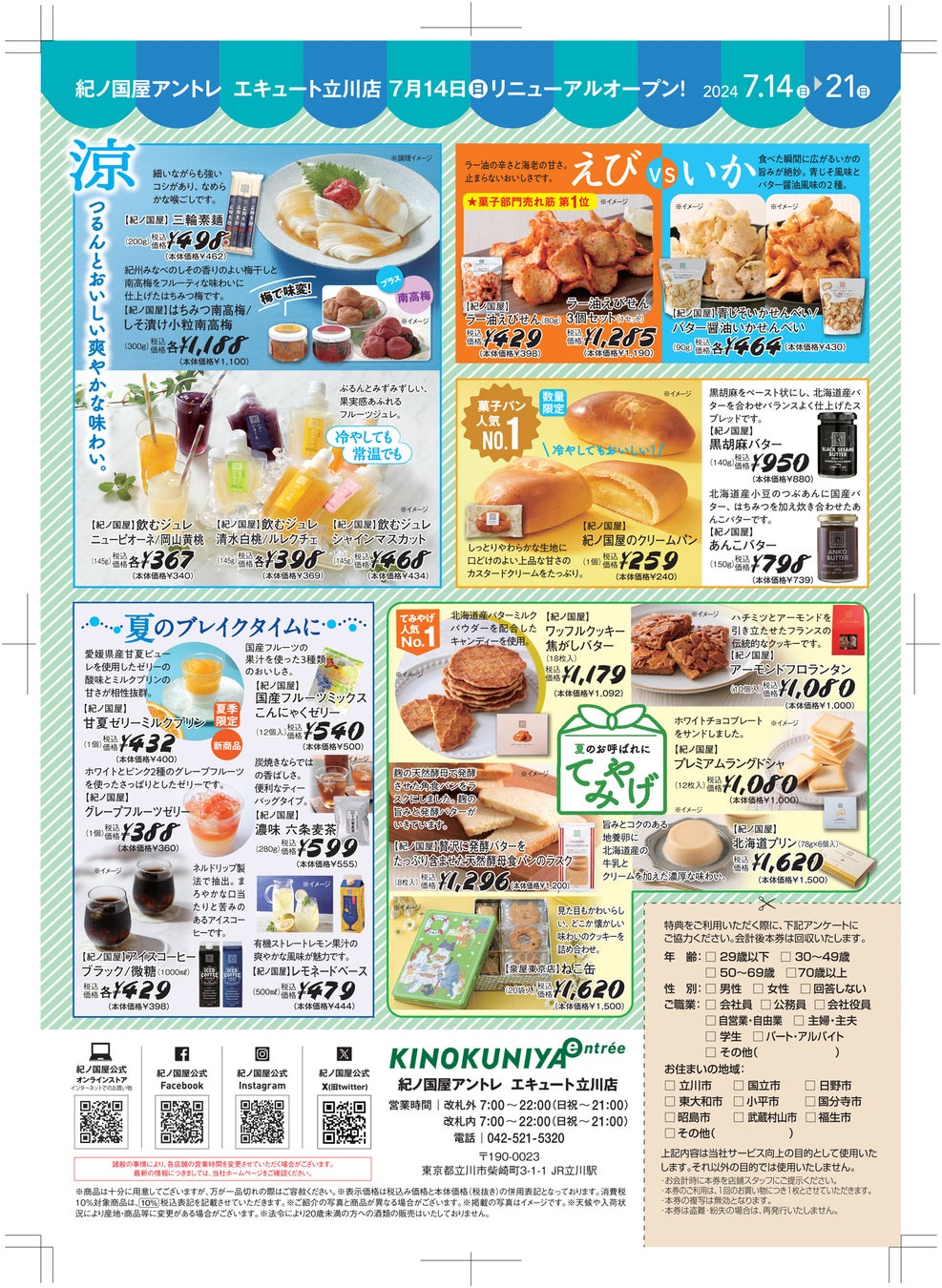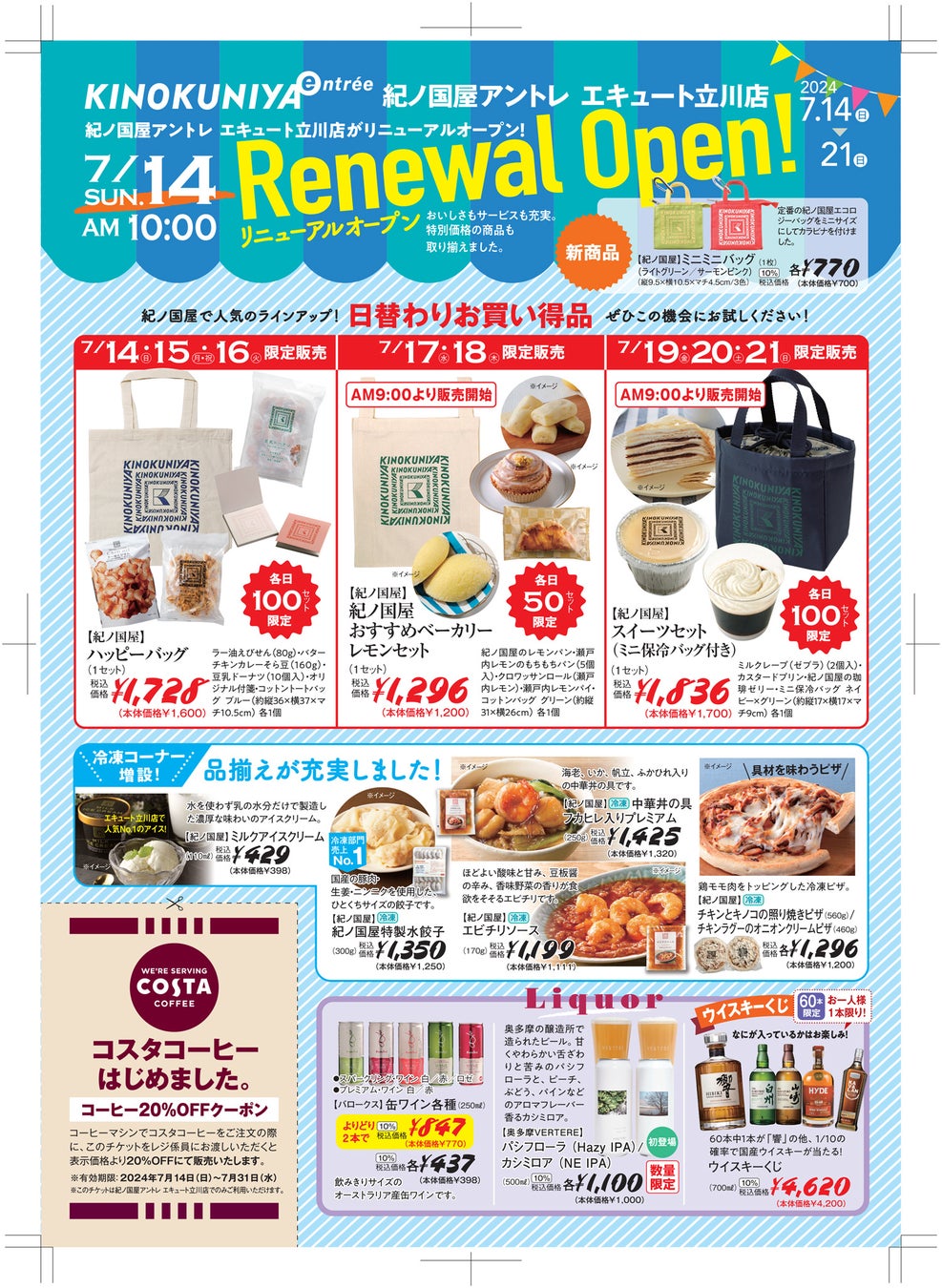 株式会社紀ノ國屋は、7月14日(日)に東京都立川市の「紀ノ国屋 アントレ エキュート立川店」をリニューアルオープンいたします。7月14日(日)から7月21日(日)までの間、日替わりで特別な記念セットを数量限定でご用意いたします。ぜひこの機会にお店にお立ち寄りください!
